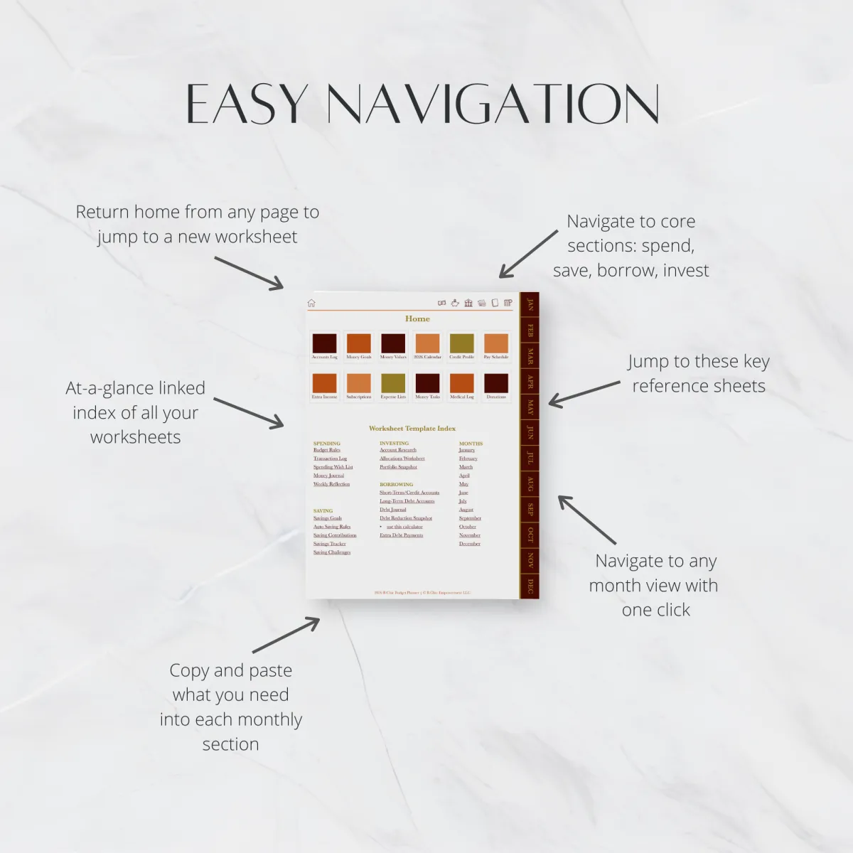 The Intentional Money Planner is the fastest way to get clear about your money goals and priorities in order to make room for more savings, experiences, and future wealth. This digital planner is dated, with dedicated calendar pages and a plethora of budgeting worksheets to stay organized throughout the year.