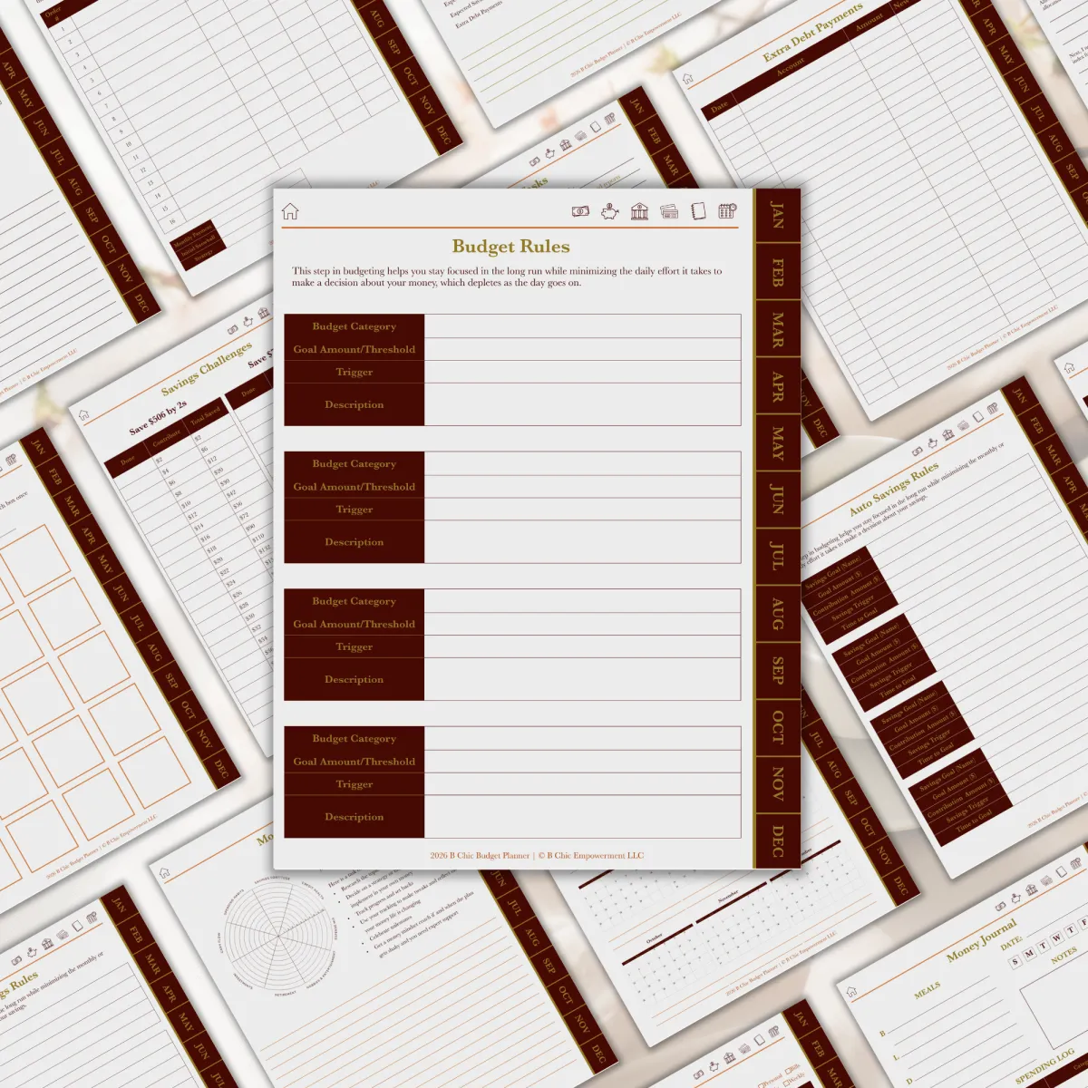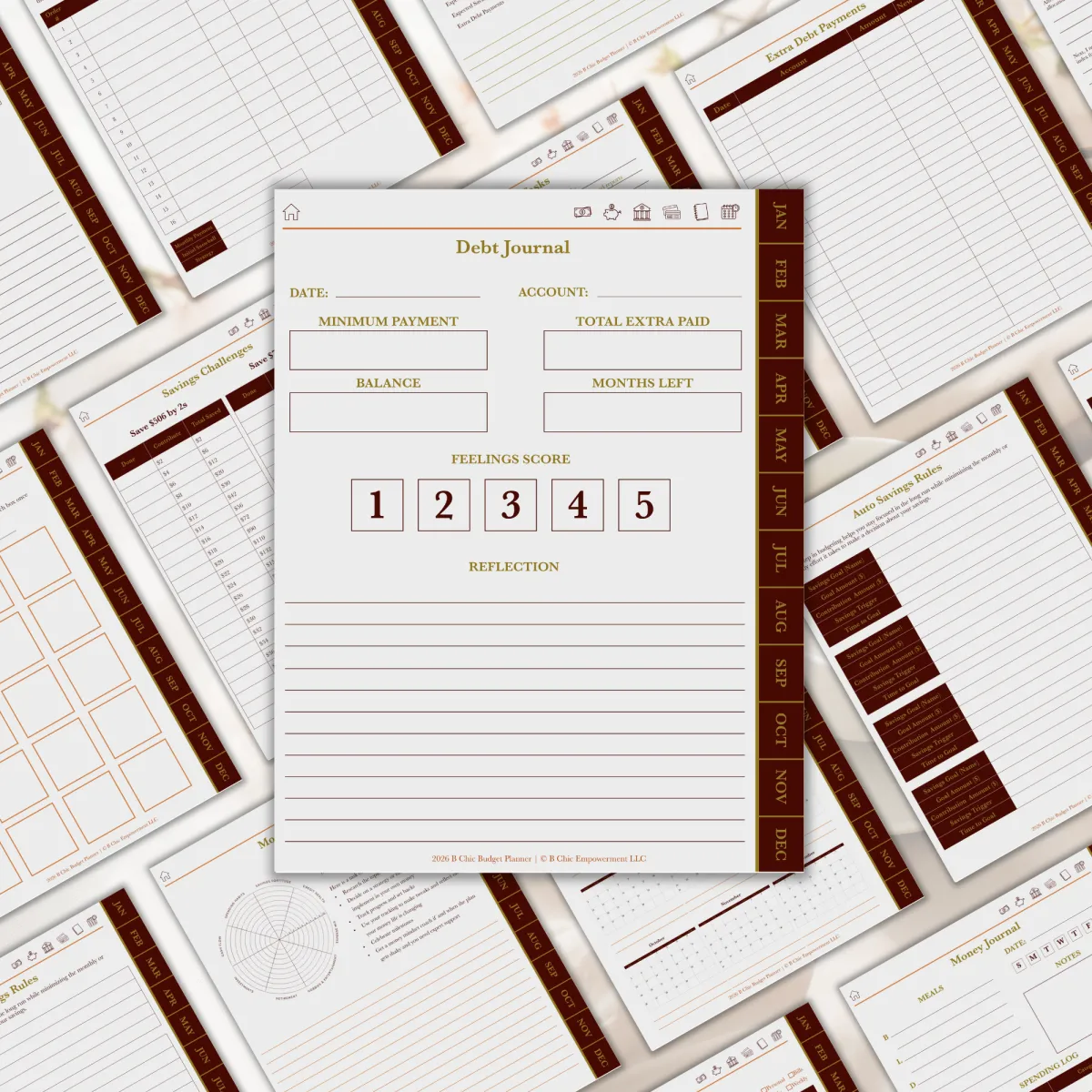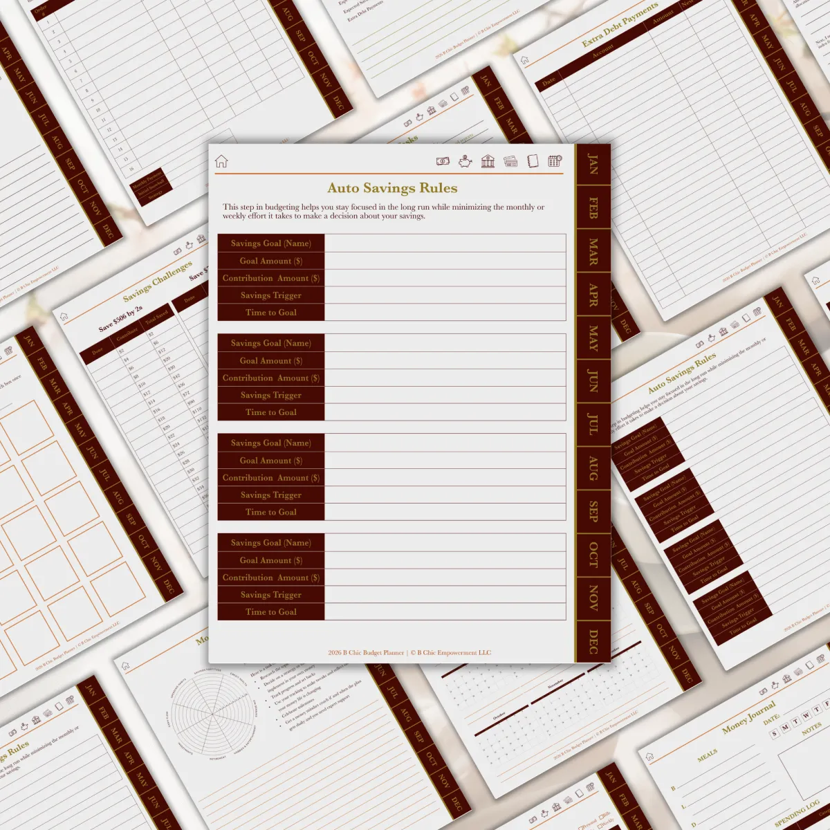 Start your budgeting journey by gaining awareness of the most important factors that affect you on a regular basis. Auto-payments, credit cards and their interest rates, and even your bank account’s basic information. Having the important stuff in one place gives you the first step in getting clarity on your money situation. The daily and weekly money journal also gives you a glimpse of your spending habits and patterns.